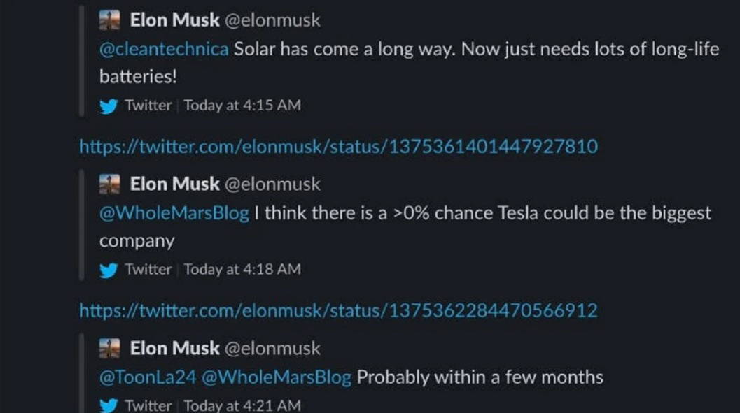 Takipçilerinden birine yanıt veren Musk, "Tesla'nın en büyük şirket olma ihtimali yüzde 0'dan fazla" yazdı. Musk ayrıca bunun birkaç ay içerisinde olacağını söyledi. Oldukça iddialı tweet kısa sürede tartışma yaratırken Elon Musk attığı tweet'i tartışmalar büyümeden sildi.