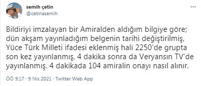 Çetin, açıklamaya imza atan bir emekli amiralin kendisine, "metinde değişiklik yapılarak 3 Nisan 2021 günü saat 22.50’de onaya sunulduğu" bilgisi verdiğini aktardı.