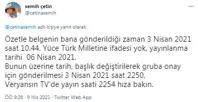 Çetin, değişiklik yapılan metnin 3 Nisan 2021 saat 22.50’de onaya sunulduğunu ve Veryansın TV'de bundan 4 dakika sonra söz konusu metnin yayımlandığına dikkati çekti.