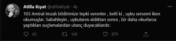 Kıyat Twiiter hesabından yaptığı paylaşımda, "103 Amiral imzalı bildirimize tepki verenler, belli ki uyku sersemi iken okumuşlar. Sabahleyin, uykularını aldıktan sonra bir daha okurlarsa yaptıkları suçlamalardan utanç duyacaklardır." ifadesini kullandı.