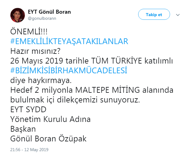 Derneğin Yönetim Kurulu Başkanı Gönül Boran sosyal medya hesabı üzerinden 26 Mayıs'ta bir miting düzenlemek için başvurduklarını açıkladı. Boran, İstanbul'da düzenlenecek mitinge 2 milyon kişinin katılımını hedeflediklerini belirterek çağrı yaptı.
