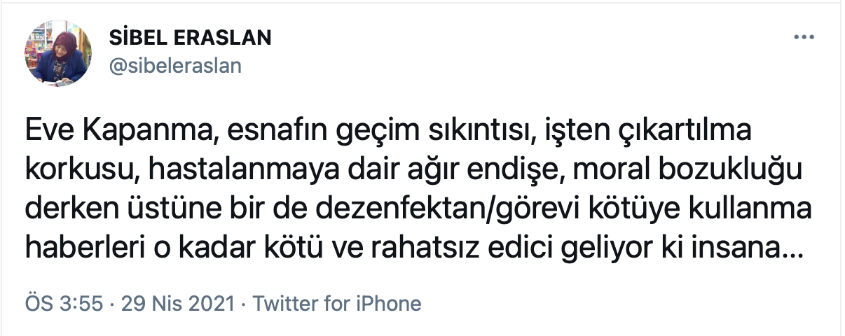 Sibel Eraslan Twitter hesabından yaptığı paylaşımda, "Eve kapanma, esnafın geçim sıkıntısı, işten çıkartılma korkusu, hastalanmaya dair ağır endişe, moral bozukluğu derken üstüne bir de dezenfektan/görevi kötüye kullanma haberleri o kadar kötü ve rahatsız edici geliyor ki insana..." ifadesini kullandı.