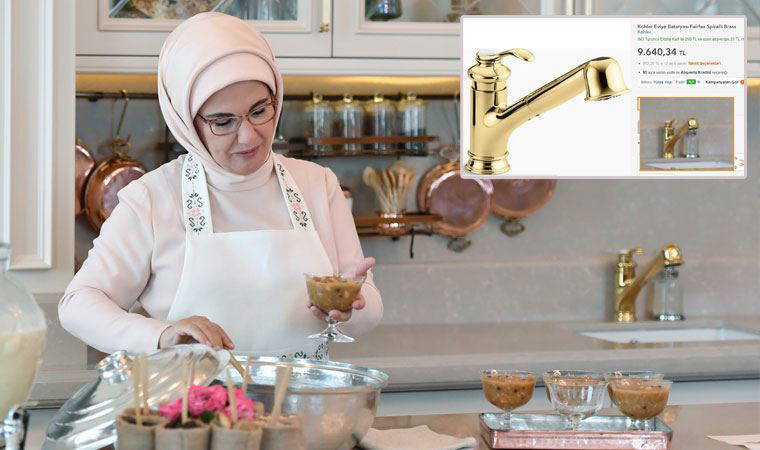 AKP'li Cumhurbaşkanı Recep Tayyip Erdoğan'ın eşi Emine Erdoğan, kişisel Twitter hesabında mutfakta çekilen fotoğraflarını paylaştı. Emine Erdoğan'ın paylaşımında yer alan altın varaklı musluk yurttaşların tepkisini çekti. Musluğu alışveriş sitelerinden aratan sosyal medya kullanıcıları ise 10-13 bin liraya yaklaşan fiyatlarla karşılaştığını söyledi.