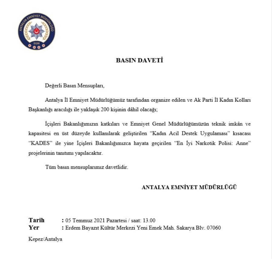 Antalya Emniyet Müdürlüğü'nün basın davetinde, “İçişleri Bakanlığımızın katkıları ve Emniyet Genel Müdürlüğümüzün teknik imkan ve kapasitesi en üst düzeyde kullanılarak geliştirilen ‘Kadın Acil Destek Uygulaması’ kısacası ‘KADES’ ile yine İçişleri Bakanlığımızca hayata geçirilen ‘En İyi Narkotik Polisi: Anne’ projelerinin tanıtımı yapılacaktır” bilgilendirmesi yapıldı.