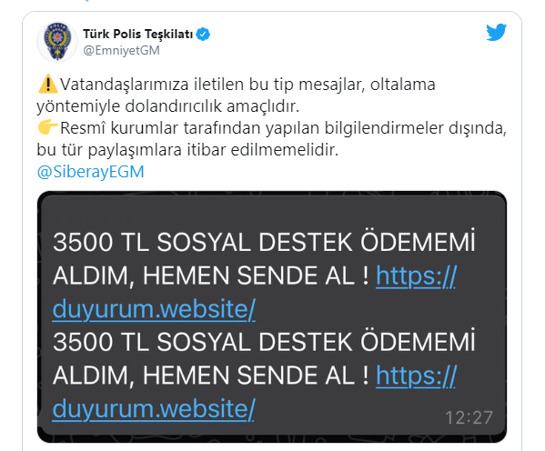 Emniyet Genel Müdürlüğünün (EGM) resmi Twitter hesabından yapılan paylaşımda, sosyal medya sitelerinde yer alan veya kısa mesajla gönderilen "sosyal yardım" vadeden internet uzantılı iletilerin dolandırıcılık amacı taşıdığı bildirildi.