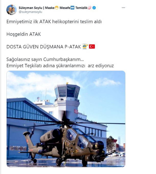 Bakan Süleyman Soylu Twitter hesabından, teslim edilen ATAK helikopterinin fotoğrafını paylaşarak, "Emniyetimiz ilk ATAK helikopterini teslim aldı. Hoş geldin ATAK. Dosta güven, düşmana P-ATAK. Sağ olasınız Sayın Cumhurbaşkanım. Emniyet Teşkilatı adına şükranlarımızı arz ediyoruz." ifadelerini kullandı.