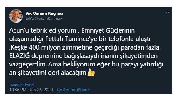 Emekli Hâkim Osman Kaçmaz, sosyal medyada “Acun’u tebrik ediyorum. Emniyet Güçlerinin ulaşamadığı Fettah Tamince’ye bir telefonla ulaştı. Keşke 400 milyon zimmetine geçirdiği paradan fazla Elazığ depremine bağışlasaydı inanın şikâyetimden vazgeçerdim.. Ama bekliyorum eğer bu parayı yatırdığı an şikâyetimi geri alacağım” mesajını yayımladı.