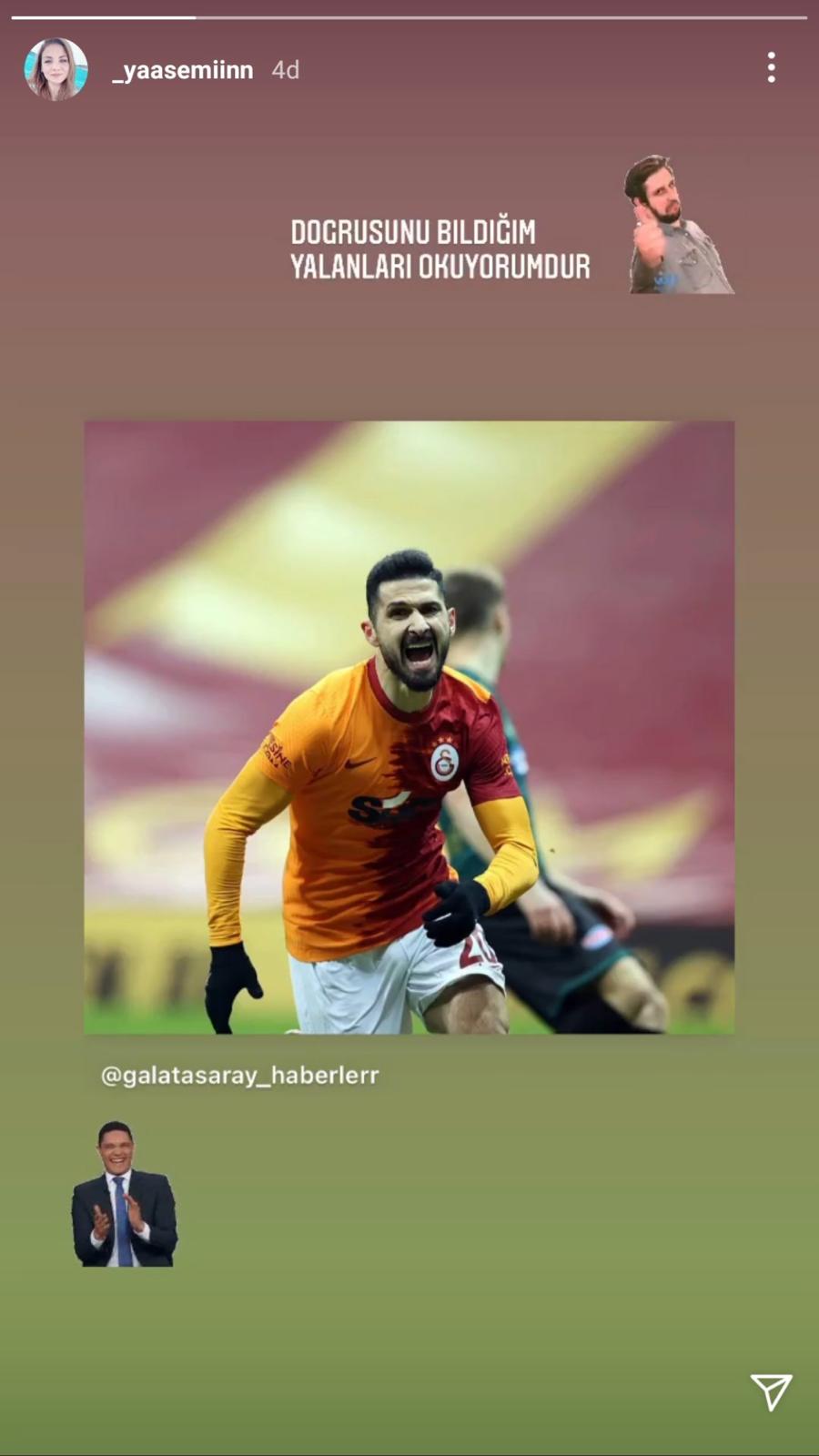 Galatasaraylı futbolcunun eşi haberlerden birisini hikayesine ekleyerek "Doğrusunu bildiğim yalanları dinliyorumdur" ifadesini kullandı. Emre Akbaba'nın sene sonu Galatasaray ile olan sözleşmesi sona eriyor.