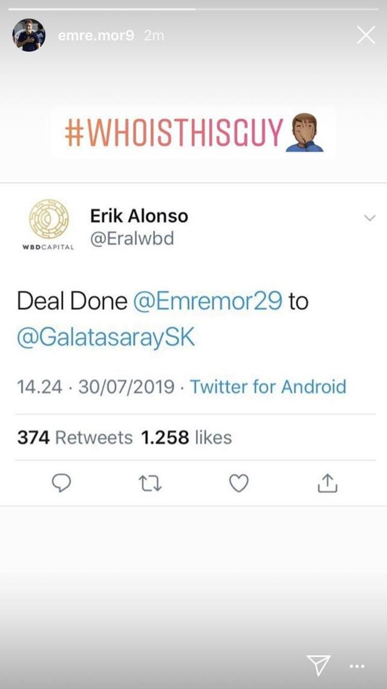 WBD Menajerlik Şirketi'nin CEO'su Erik Alonso, Emre Mor'un Galatasaray'a transferinin tamamlandığını açıklamıştı. Bunun üzerine Emre Mor, Instagram hesabından Erik Alonso'nun attığı tweet'i alıntılayarak, "Bu adam kim" notunu düştü.