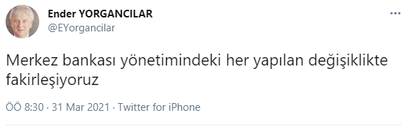 Cumhurbaşkanı Recep Tayyip Erdoğan'ın imzasıyla Merkez Bankası Başkanı Naci Ağbal'ın görevden alınmasının ardından yaşanan Türk Lirası'ndaki değer kaybına bir tepki de TOBB Yönetim Kurulu Eski Üyesi Ender Yorgancılar'dan geldi.