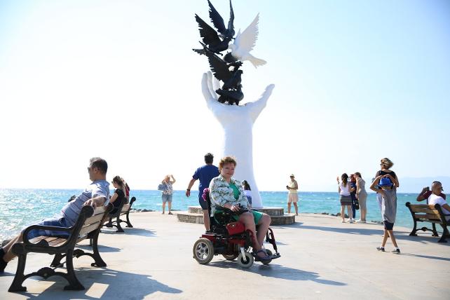 20 yıldır tanısı konulamayan bir kas hastalığı yaşayan ve son iki yıldır tekerlekli sandalye kullanmaya başlayan Deniz Öztürk, engelli yurttaşlar için kolaylaştırılan Kuşadası'nda yaşamaya başladı. "Adım Deniz olmasına rağmen denize girmeye hasrettim" diyen Öztürk, kentin içerisinde özgürce gezmesini sağlayan ve hayatını kolaylaştıran çözümler için Aydın Büyükşehir Belediye Başkanı Özlem Çerçioğlu'na teşekkür etti.
