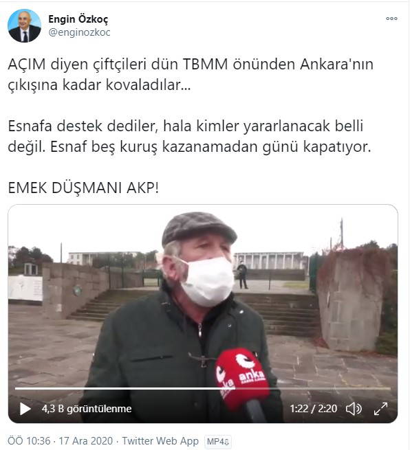 Sosyal medya hesabı üzerinden polislerin çiftçilere müdahale ettiği anların videosunu paylaşan Özkoç "Açım diyen çiftçileri dün TBMM önünden Ankara'nın çıkışına kadar kovaladılar... 'Esnafa destek' dediler, hala kimler yararlanacak belli değil. Esnaf beş kuruş kazanamadan günü kapatıyor. Emek düşmanı AKP" tepkisinde bulundu.