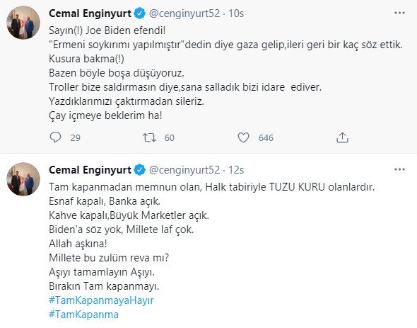 Enginyurt, “Joe Biden Unutuldu. Tam kapanma konuşuldu. Gündem değiştirmede üzerinize yok. Bidona gelince Sayın, esnafa gelince kapayın. Sayın Cumhurbaşkanı” diye tepki gösterdi.