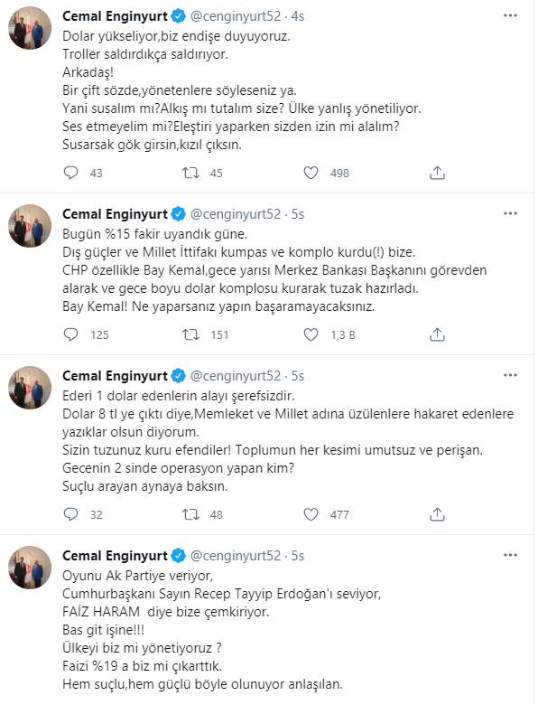 Cemal Enginyurt, Türkiye Cumhuriyet Merkez Bankası (TCMB) Başkanı'nın değiştirilmesi ve pazar gecesinden bu yana döviz kurlarında yaşanan artışla ilgili Cumhurbaşkanı Recep Tayyip Erdoğan'ı kendi sözleriyle eleştirdi. Enginyurt, "CHP, özellikle Bay Kemal gece yarısı Merkez Bankası Başkanı'nı görevden alarak ve gece boyu dolar komplosu kurarak tuzak hazırladı" dedi.