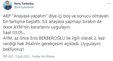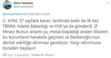 AYM'nin 37 sayfalık kararı, tarihinde belki de ilk kez TBMM, Adalet Bakanlığı ve HSK'ya da gönderdiğini belirten Yarkadaş, "Bunun anlamı şu; mesai başladığı andan itibaren bu kurumların harekete geçmesi ve Berberoğlu'nun derhal vekilliğe dönmesi gerekiyor. Yargı reformuna buradan başlayın!" ifadelerini kullandı.