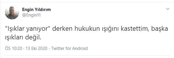 Söz konusu paylaşımının ardından tekrar tweet atan Yıldırım, ''Işıklar yanıyor" derken hukukun ışığını kastettim, başka ışıkları değil'' ifadelerini kullandı.