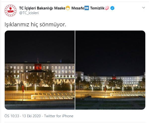 Yıldırım'ın bu paylaşımının ardından İçişleri Bakanlığı, bakanlık binasının fotoğrafını paylaşarak, ''Işıklarımız hiç sönmüyor'' diye yazdı.