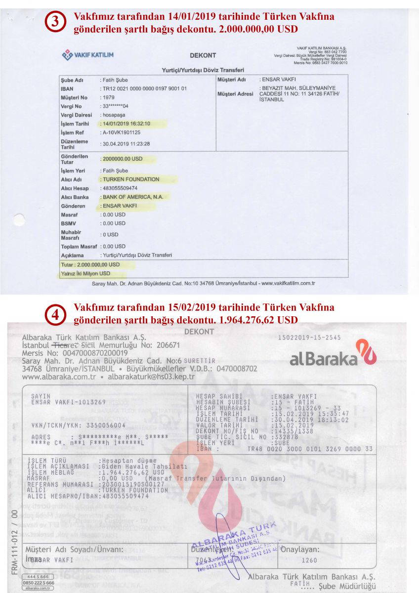 Ensar Vakfı, açıklamasında ayrıca makbuzlar paylaşıldı: