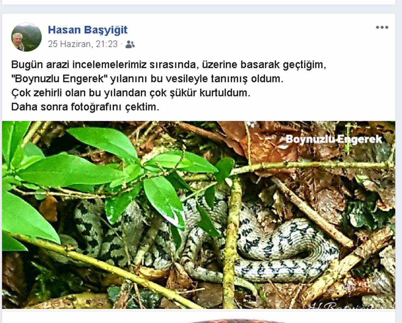 Büyük korku yaşadığı belirten Hasan Başyiğit, "Doğa Koruma ve Milli Parklar Genel Müdürlüğümüzün başlattığı Biyoçeşitlilik Envanter ve İzleme Projeleri kapsamında yapılan çalışmalarda boynuzlu engerek yılanının tespiti yapılarak veri tabanına girilmiştir. Bu yılan türünün tespit edildiği yerlerden birisi de Küre Dağları Milli Parkımız olmuştur. Son olarak bu milli parkımızda yaptığımız yürüyüş yolu yapım çalışmaları sırasında, ekibimiz ile birlikte yaptığımız denetimler sırasında bizzat kendim bu boynuzlu engerek yılanının üzerine bilmeden basarak geçtiğimi fark ettim. İncelediğimizde bunun boynuzlu engerek yılanı olduğunu ekipteki uzman arkadaşlarımız teşhis ettiler. Bu yılanın çok zehirli olduğunu fakat kendisini tehlikede hissetmediği sürece saldırmadığını bu vesile ile daha yakından tanımış olduk" dedi.