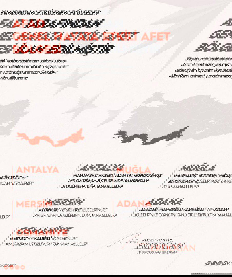 AKP Genel Başkanı ve Cumhurbaşkanı Recep Tayyip Erdoğan, "Orman yangınlarından etkilenen bölgelerimizi "Genel Hayata Etkili Afet Bölgesi" ilan ettik. Milletimizin yaralarını sarmak, zararını karşılamak, imkânlarını öncekinden de iyi hale getirmek için gereken tüm adımları atmaya devam edeceğiz" açıklaması yaptı.