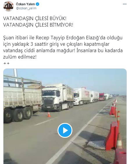 Erdoğan depremzedelere çay dağıtırken, şehrin bir başka noktasında ise TIR ve kamyon şoförlerinin tepkili bekleyişlerinin olduğu öğrenildi. Ağır vasıta araçların şehre giriş çıkışlarının engellenmesi nedeniyle saatlerce kontak kapatıp bekleyen şoförler, yaşadıkları mağduriyet nedeniyle tepki gösterdi.