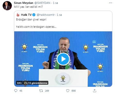 Daha sonra Rize'ye yönelik yapılacaklarla konuşan AKP'li Cumhurbaşkanı "2023'te inşaallah Rize'nin yerel mimarisiyle şöyle tüm konutlarımızı yenilesek ne güzel olur değil mi?" diye sordu. Salondan sloganlarla karşılık gelmesi üzerine Erdoğan, "Oo bak gençler nasıl coştu görüyorsunuz. Buradan bir müjde daha verelim. Aralık 2023'te Rize-Artvin Havalimanı'nı bitiriyoruz" ifadelerini kullandı. Salondan havalimana verilecek isimle ilgili gelen bir öneri üzerine de Erdoğan, Karadeniz şivesiyle "Onu karıştırma şimdi" diye yanıt verip güldü.