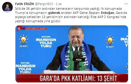 Erdoğan'ın bu anları, geçtiğimiz yıl kameralara yansıyan benzer bir görüntüyü akıllara getirdi. AKP'li Cumhurbaşkanı, Suriye'nin İdlib kentinde yaşanan ve çok sayıda askerimizin şehit olduğu saldırının ardından yaptığı konuşmada da bir "espri"li anısını anlatıp gülmüştü.