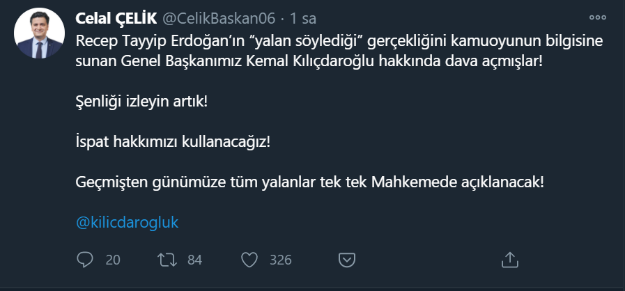 CHP lideri Kılıçdaroğlu'nun avukatı Celal Çelik yaptığı açıklamada, "Recep Tayyip Erdoğan’ın “yalan söylediği” gerçekliğini kamuoyunun bilgisine sunan Genel Başkanımız Kemal Kılıçdaroğlu hakkında dava açmışlar!