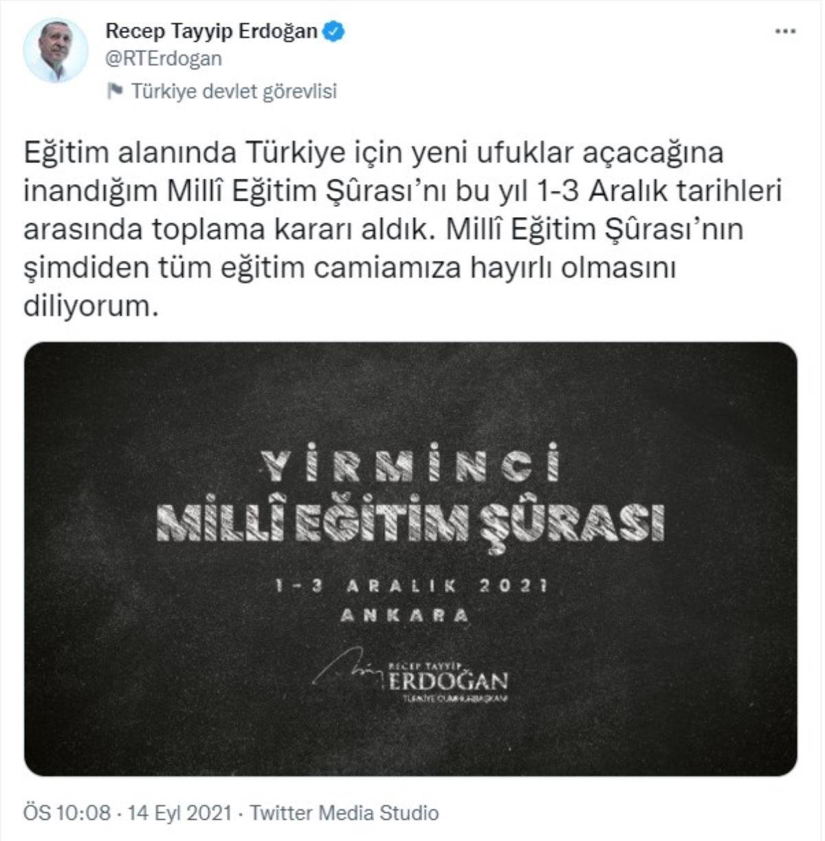 Twitter hesabından paylaşımda bulunan Erdoğan, "Eğitim alanında Türkiye için yeni ufuklar açacağına inandığım Millî Eğitim Şûrası’nı bu yıl 1-3 Aralık tarihleri arasında toplama kararı aldık. Millî Eğitim Şûrası’nın şimdiden tüm eğitim camiamıza hayırlı olmasını diliyorum" ifadelerine yer verdi.