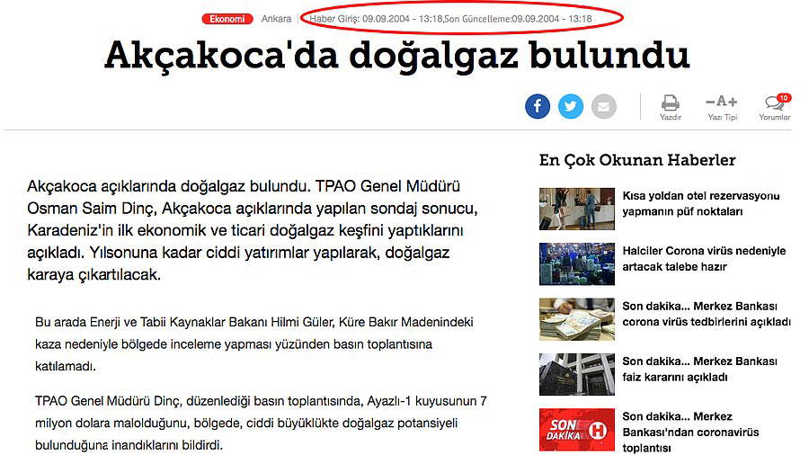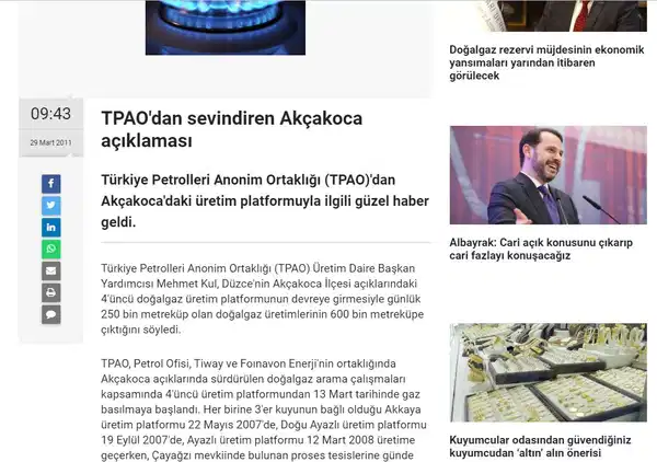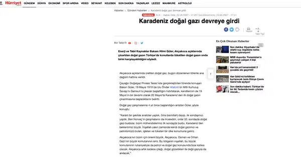 - Enerji ve Tabii Kaynaklar Bakanı Hilmi Güler, "Akçakoca açıklarında çıkartılan doğal gaz Türkiye'de konutlarda tüketilen doğal gazın 10'da birini karşılayacak" açıklamasını yapmıştı.