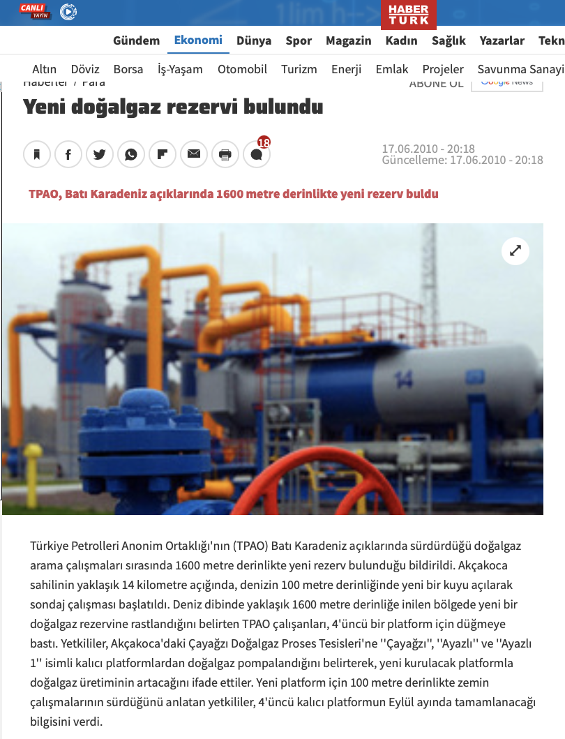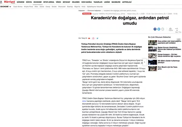 - Türkiye Petrolleri Anonim Ortaklığı'nın (TPAO) Batı Karadeniz açıklarında sürdürdüğü doğalgaz arama çalışmalarında bin 600 metre derinlikte yeni rezerv bulunduğunu, Akçakoca sahilinin yaklaşık 14 kilometre açığında denizin 100 metre derinliğinde yeni kuyu açılarak sondaj çalışması başlatıldığı haberini ise Anadolu Ajansı duyurdu.