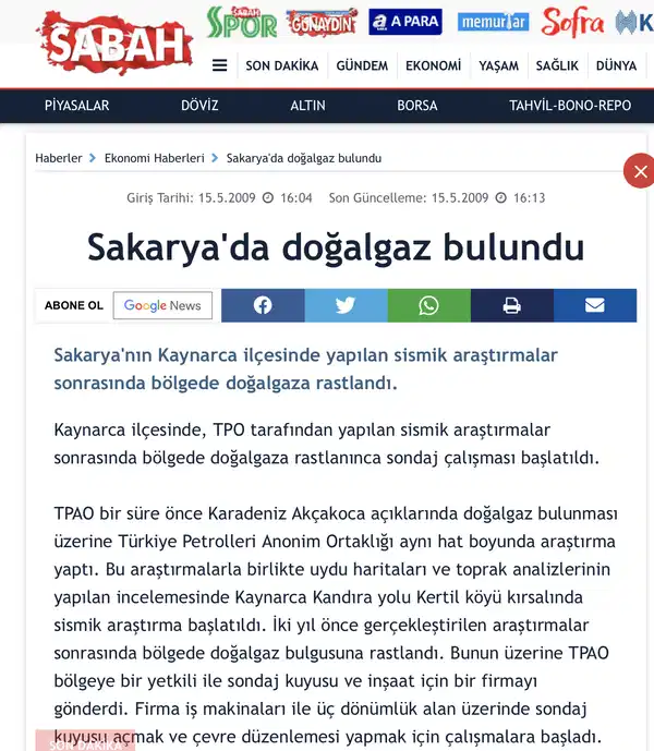 - Sakarya'nın Kaynarca ilçesinde, TPO tarafından yapılan sismik araştırmalar sonrasında bölgede doğalgaza rastlanınca sondaj çalışması başlatıldı. TPAO bir süre önce Karadeniz Akçakoca açıklarında doğalgaz bulunması üzerine Türkiye Petrolleri Anonim Ortaklığı aynı hat boyunda araştırma yaptı.