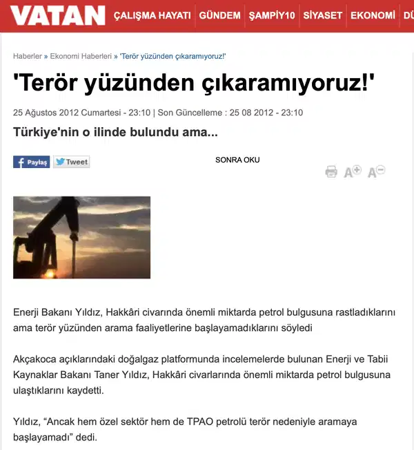 - Akçakoca açıklarındaki doğalgaz platformunda incelemelerde bulunan Enerji ve Tabii Kaynaklar Bakanı Taner Yıldız, Hakkâri civarlarında önemli miktarda petrol bulgusuna ulaştıklarını kaydetti. Yıldız, Hakkari yakınlarında petrol bulduklarını söyledi, ancak "Hem özel sektör hem de TPAO petrolü terör nedeniyle aramaya başlayamadı" diye devam etti.