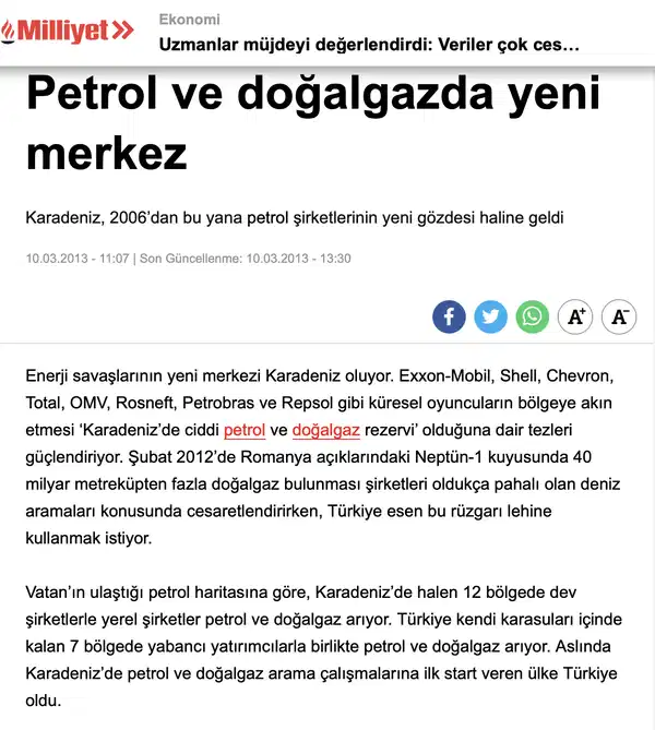 - Enerji savaşlarının yeni merkezi Karadeniz oluyor. Exxon-Mobil, Shell, Chevron, Total, OMV, Rosneft, Petrobras ve Repsol gibi küresel oyuncuların bölgeye akın etmesi “Karadeniz’de ciddi petrol ve doğalgaz rezervi” olduğuna dair tezleri güçlendiriyor.