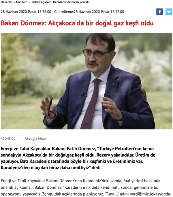BAKAN DÖNMEZ: AKÇAKOCA’DA BİR DOĞALGAZ KEŞFİ OLDU (28 HAZİRAN 2020)