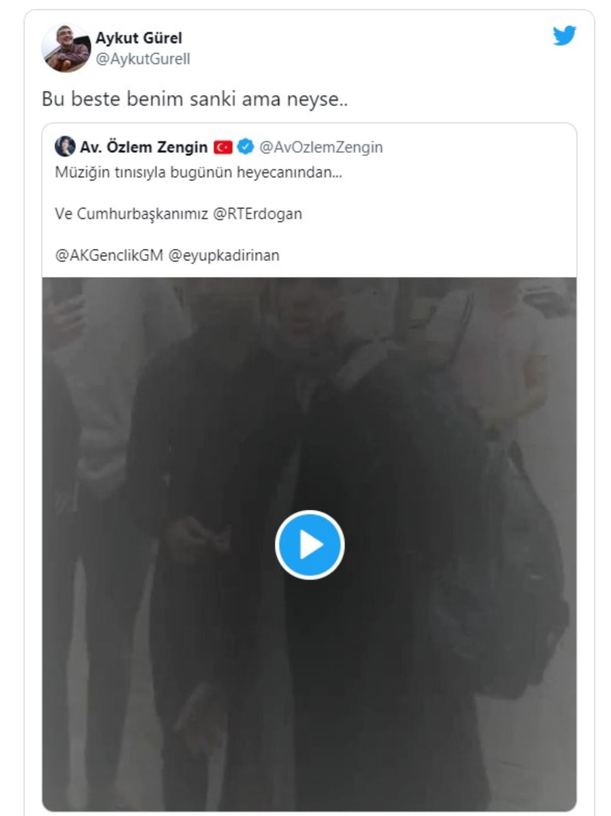Erdoğan'a telefonda dinletilen şarkının bestecisi Aykut Gürel'den tepki geldi. Zengin'in paylaştığı videoyu alıntılayan Aykut Gürel, 'gençler sizin için bestelediler' sözlerine , "Bu beste benim sanki ama neyse..." şeklinde tepki gösterdi.