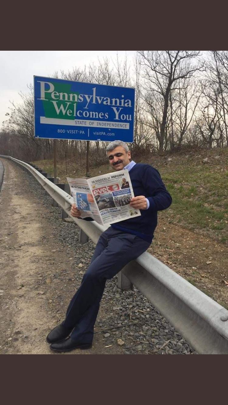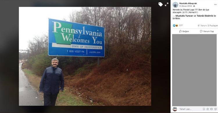 Paylaşımda Albayrak'ın 15 Nisan 2014'te "Pensilvanya" tabelasının önünde çektirdiği fotoğraf görülüyor.