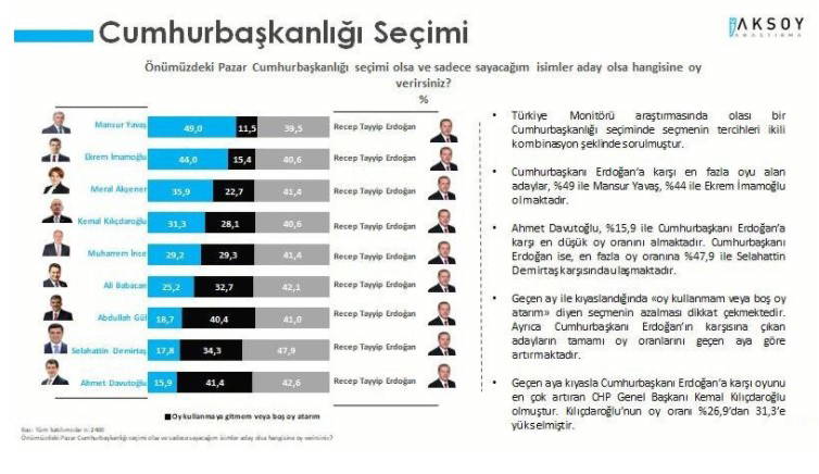 "Önümüzdeki Pazar Cumhurbaşkanlığı seçimi olsa ve sadece sayacağım isimler aday olsa hangisine oy verirsiniz?" sorusuna yanıt veren katılımcılar Erdoğan'ın karşısında en güçlü rakip olarak yüzde 49.0 oy oranı ile Mansur Yavaş'ı gördüklerini açıkladı.