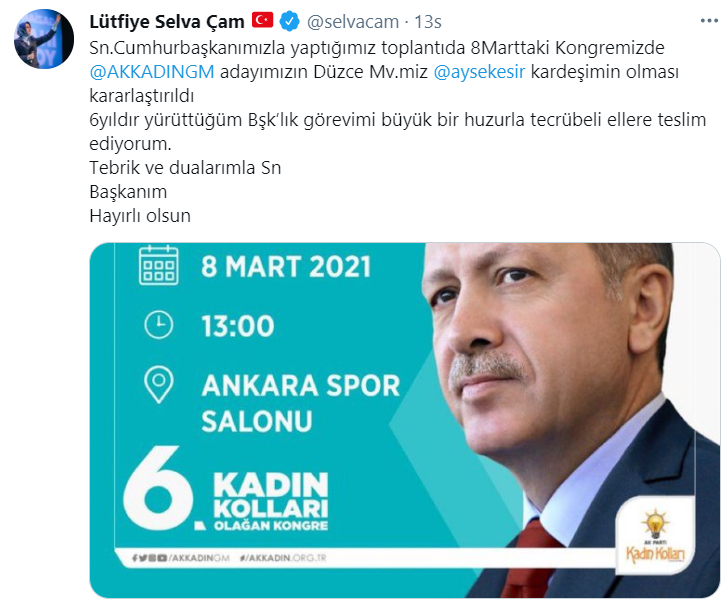 Çam açıklamasında, 6 yıldır yürüttüğü AKP Kadın Kollar Başkanlığı görevinden parti kararıyla ayrıldığını belirtti. Çam, “Sn.Cumhurbaşkanımızla yaptığımız toplantıda 8Marttaki Kongremizde AK Parti Kadın Kolları Başkanı adayımızın Düzce Mv.miz Ayşe Kesir kardeşimin olması kararlaştırıldı 6 yıldır yürüttüğüm Bşk’lık görevimi büyük bir huzurla tecrübeli ellere teslim ediyorum. Tebrik ve dualarımla Sn Başkanım Hayırlı olsun” ifadelerini kullandı.
