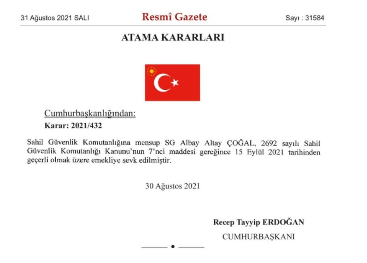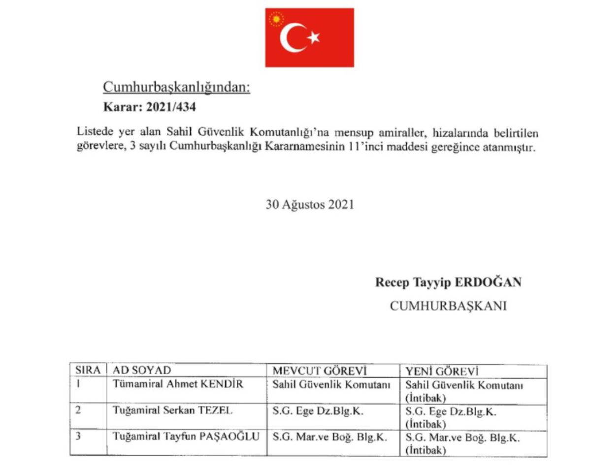 Tümamiral Ahmet Kendir Sahil Güvenlik Komutanı, Tuğamiral Serkan Tezel Ege Deniz Bölge Komutanı, Tuğamiral Tayfun Paşaoğlu Marmara ve Boğazlar Bölge Komutanı oldu.