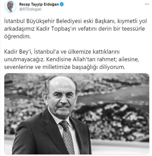 Erdoğan, "İstanbul Büyükşehir Belediyesi eski Başkanı, kıymetli yol arkadaşımız Kadir Topbaş'ın vefatını derin bir teessürle öğrendim. Kadir Bey'i, İstanbul'a ve ülkemize kattıklarını unutmayacağız. Kendisine Allah'tan rahmet; ailesine, sevenlerine ve milletimize başsağlığı diliyorum" mesajını paylaştı.