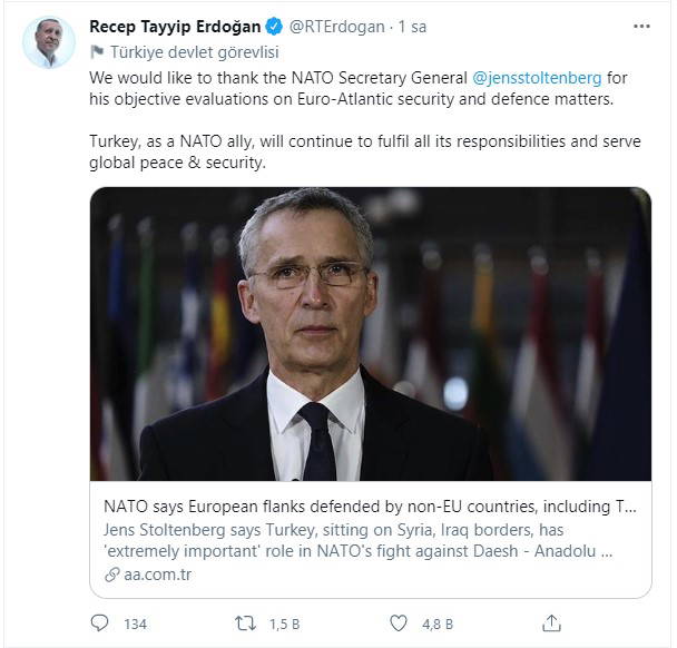 Erdoğan, "NATO Genel Sekreteri Jens Stoltenberg'e Avrupa-Atlantik güvenlik ve savunma konularında objektif değerlendirmeleri için teşekkür ederiz. Türkiye, bir NATO müttefiki olarak tüm sorumluluklarını yerine getirmeye, küresel barış ve güvenliğe hizmet etmeye devam edecektir" dedi.
