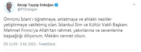 "Ömrünü İslam'ı öğretmeye, anlatmaya ve ahlaklı nesiller yetiştirmeye vakfetmiş olan, İstanbul İlim ve Kültür Vakfı Başkanı Mehmet Fırıncı'ya Allah'tan rahmet, yakınlarına ve sevenlerine başsağlığı diliyorum. Mekanı cennet olsun."