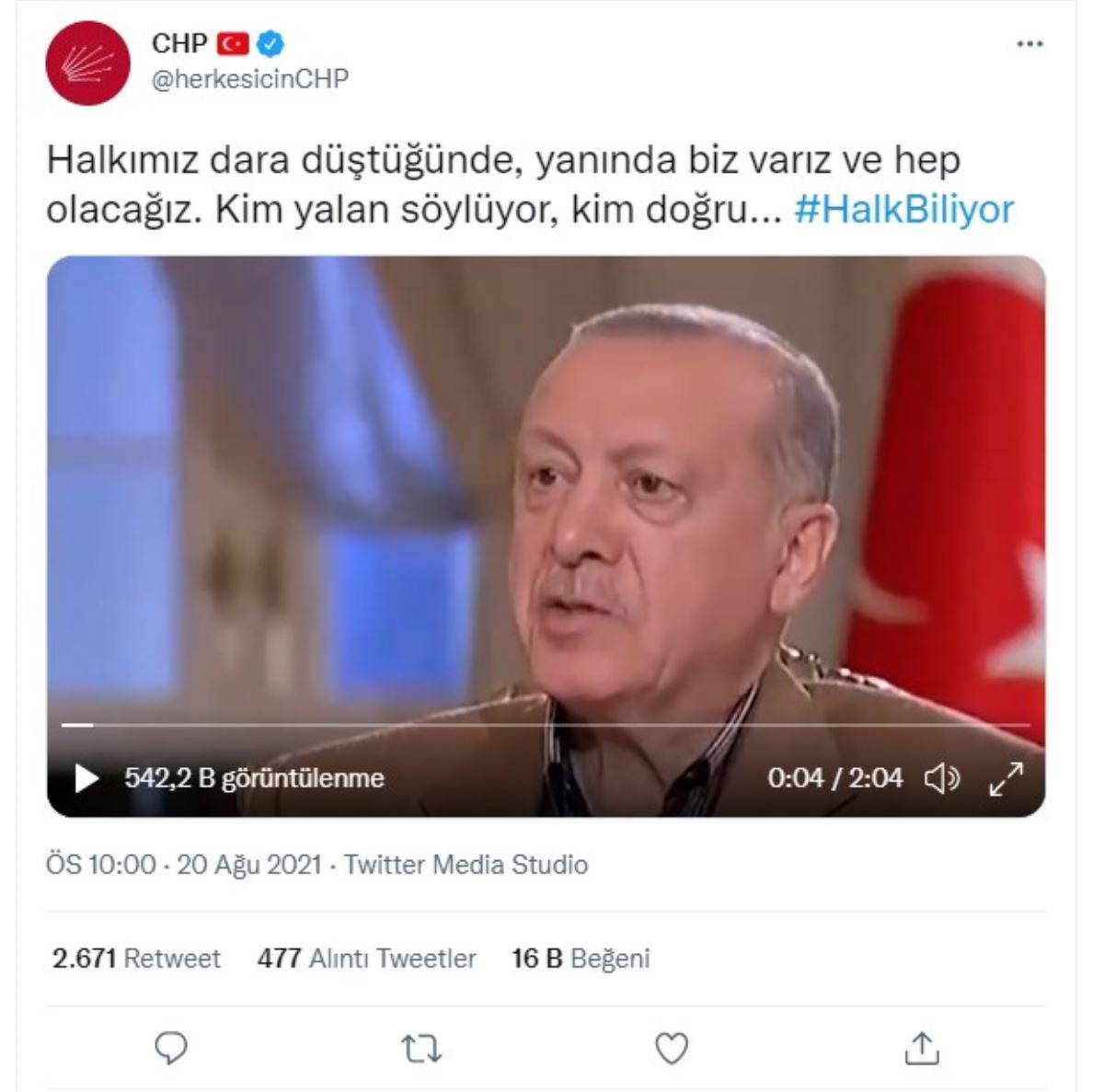 CHP Genel Merkezi’nin sosyal medya hesabından yapılan videolu paylaşımda, Erdoğan’ın su sözlerinin ardından CHP'li belediyelerin yangın ve sel bölgelerindeki faaliyetlerine yer verildi. Paylaşımda, "Halkımız dara düştüğünde, yanında biz varız ve hep olacağız. Kim yalan söylüyor, kim doğru... #HalkBiliyor" ifadeleri kullanıldı.