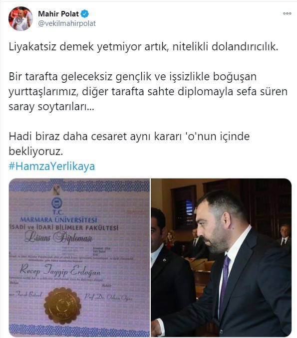 Yerlikaya'ya "Liyakatsiz demek yetmiyor artık, nitelikli dolandırıcılık" sözleriyle tepki gösteren Polat, Erdoğan'ın isminin geçtiği diplomayı paylaşarak, "Hadi biraz daha cesaret aynı kararı 'o'nun için de bekliyoruz" dedi.