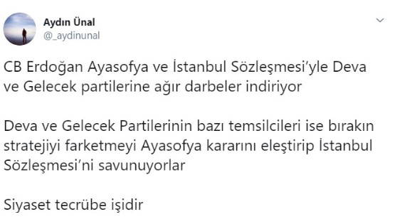 “Erdoğan Ayasofya ve İstanbul Sözleşmesi’yle Deva ve Gelecek partilerine ağır darbeler indiriyor Deva ve Gelecek Partilerinin bazı temsilcileri ise bırakın stratejiyi farketmeyi Ayasofya kararını eleştirip İstanbul Sözleşmesi’ni savunuyorlar. Siyaset tecrübe işidir”