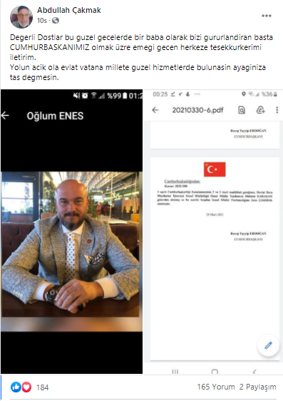 Erdoğan’ın eski yol arkadaşlarından Refah Partili eski Bekirpaşa Belediye Başkanı Abdullah Çakmak, oğlunun DHMİ Genel Müdür Yardımcısı olarak atanmasının ardından sosyal medyada mesaj yayınladı.