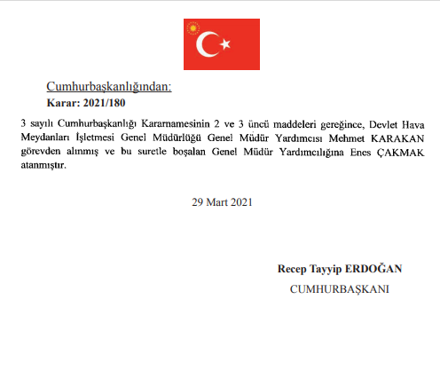 Devlet Hava Meydanları İşletmesi (DHMİ) Genel Müdür Yardımcısı Mehmet Karakan gece yarısı yayımlanan Cumhurbaşkanlığı Kararnamesiyle görevinden alındı. Yerine ise Refah Partili Eski Belediye Başkanı Abdullah Çakmak’ın oğlu Enes Çakmak getirildi.