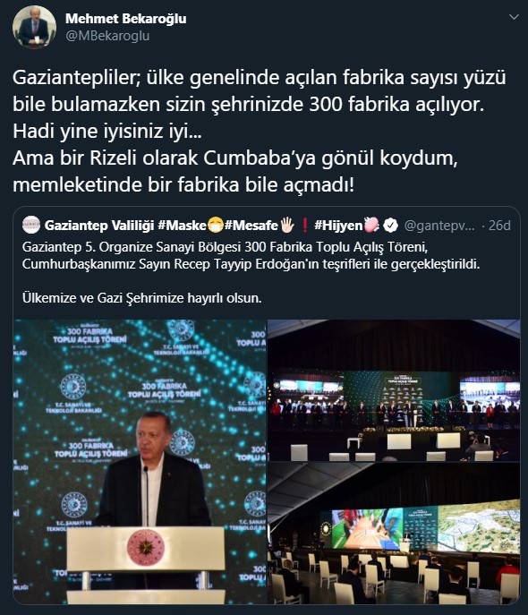 Gaziantep 5. Organize Sanayi Bölgesi bölgesi açılışında konuşan AKP'li Cumhurbaşkanı Recep Tayyip Erdoğan Gaziantep'de 300 fabrika açma müjdesi verdi. Gaziantep Valiliği'nin attığı "Gaziantep 5. Organize Sanayi Bölgesi 300 Fabrika Toplu Açılış Töreni, Cumhurbaşkanımız Sayın Recep Tayyip Erdoğan'ın teşrifleri ile gerçekleştirildi" tweetini alıntılayan CHP İstanbul Milletvekili Mehmet Bekaroğlu ise sosyal medya hesabı üzerinden, "Gaziantepliler; ülke genelinde açılan fabrika sayısı yüzü bile bulamazken sizin şehrinizde 300 fabrika açılıyor. Hadi yine iyisiniz iyi... Ama bir Rizeli olarak Cumbaba’ya gönül koydum, memleketinde bir fabrika bile açmadı!" diye konuştu.