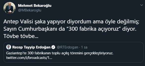Bekaroğlu, daha sonra Erdoğan'ın attığı "Gaziantep'te 300 fabrikanın toplu açılış törenini gerçekleştiriyoruz" tweetini alıntılayarak, "Antep Valisi şaka yapıyor diyordum ama öyle değilmiş; Sayın Cumhurbaşkanı da “300 fabrika açıyoruz” diyor. Tövbe tövbe..." ifadelerini kullandı.